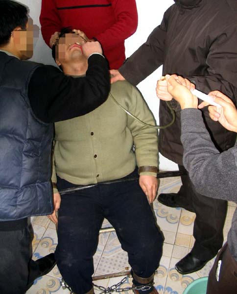 劳教所的管理科长郑海令将李文军的绝食以自伤自残定论,不但没有将李文军的不公的违法劳教决定和法律诉讼情况向上级反映,而且对李文军进行野蛮的强制灌食,将李文军固定在专用的铁椅子上,手脚全身全部固定,一动不能动。然后强行下鼻饲,灌苞米面粥加大量盐。直接插管到胃里,鼻子和胃里出大量的血(演示图6)。