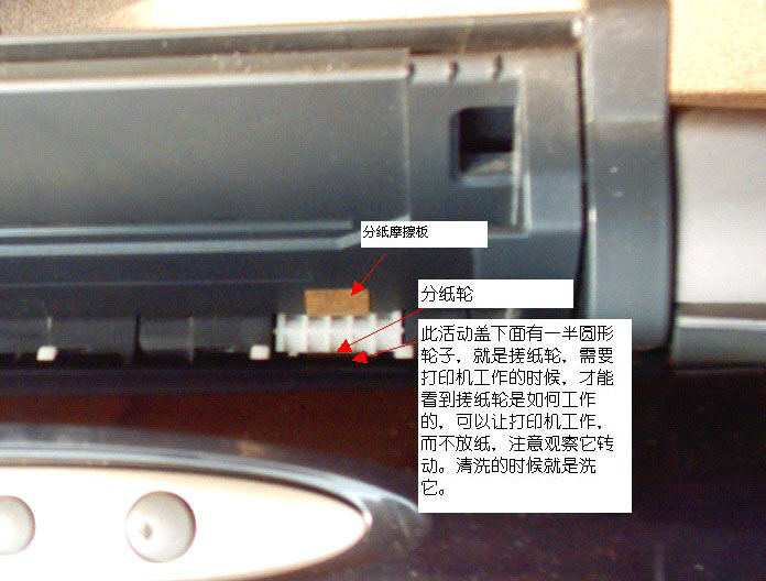 1、 可以先用酒精洗一下(洗搓纸轮的位置如图)。如果其它纸很顺利,只有光滑的彩喷纸或不干胶光盘封面纸有问题,那可以采取把纸先進打印机的那头(就是下面)用手把纸弯一下,就是向上弯一下,可以解决部分问题。