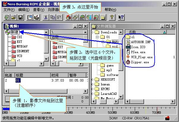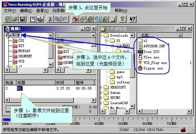 附加说明:前几天我也碰到和这位同修一模一样的问题,也是用的是NERO6.0,花了我好几个小时才成功,原来很简单:除了要把启动包裹内的文件拖到光盘的“根目录”,还一定要将视频文件拖放到光盘“根目录”,而不是光盘自带的文件名“vcd”的目录。如果拖到光盘自带的文件名“vcd”的目录中,就会出现同修提到的 “点击播放VCD影碟一项,播放界面只是显示NERO的菜单栏,不能播放,其他两项则可以”这种现象。