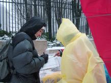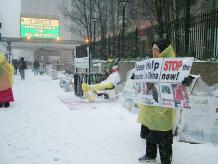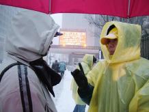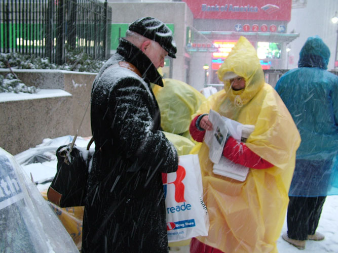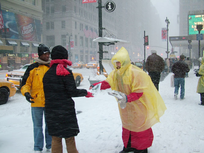 【明慧网2005年1月24日】(明慧记者报道)一场强大的冬季暴风雪星期六(1月22日)袭击美国东北部地区,寒冷的风暴给某些地区带了60公分以上的大雪。寒冷气温在高达每小时97公里的大风吹袭下,使情况变得更加糟糕。星期六这场暴风造成公路交通困难,并使美国东北及中西部地区不得不取消数以百计的航班。大风雪中,来自不同国家的部分法轮功学员依然宁静的来到曼哈顿街头给路人讲真象、办