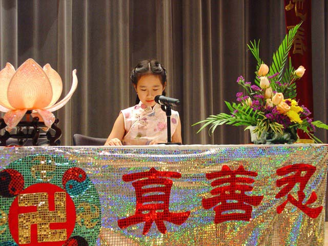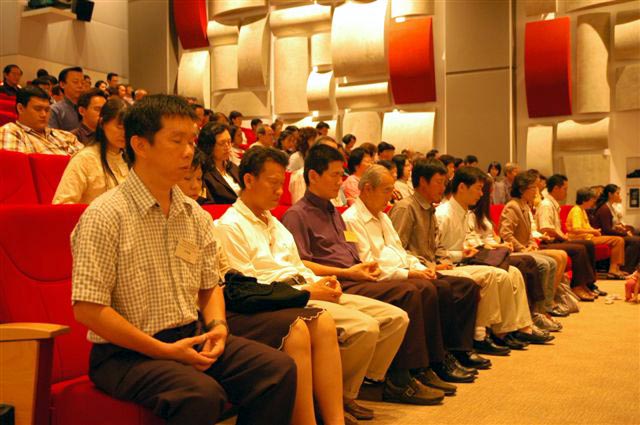 法会期间还放映了“放光明”电视台制作的“永恒的故事”和反映一百多名新加坡法轮功学员陆续奔赴曼哈顿证实法的幻灯片“唤醒曼哈顿”。心得交流结束后,新加坡学员献上三首合唱,之后全体学员上台恭祝师尊新年好。大会在热烈、祥和的气氛中落幕。回顾过去,展望未来,感谢师父的呵护!