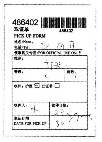 我的中国护照于2004年7月27日到期。因为当时护照正在英国移民局办理工作签证,8月底我才拿到了护照。后来又因需要到银行开户,我于9月13日来到爱丁堡中国领事馆。里边的工作人员让我出示护照,当时我没有带。他说有的人给办理,有的人就不给办理,不用浪费时间来回跑。我说我今天来领申请表。随后一周的周一我来到中领馆延护照。他告诉我还需要写一份说明,讲清为什么护照过期了才来申请。于是9月27日,我递交了我的全部材料。工作人员给我开了取证单,让我9月30日来取。当天我在诊所上班时,大概是下午1点左右,我接到了中领馆工作人员的电话。他说机器出了故障,并说要我“十一”以后等电话。