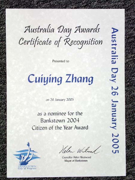最受关注的是她在澳洲纽省高等法院起诉迫害法轮功的元凶、前中共总书记江泽民一案。参加颁奖仪式的政府官员和社会人士都对诉江案关切询问和表示支持。章女士是以自己亲身受迫害的经历做为起诉证据。两个星期前,她和其他法轮功学员在本地艺术馆向民众演示中国大陆法轮功学员所遭受的酷刑。