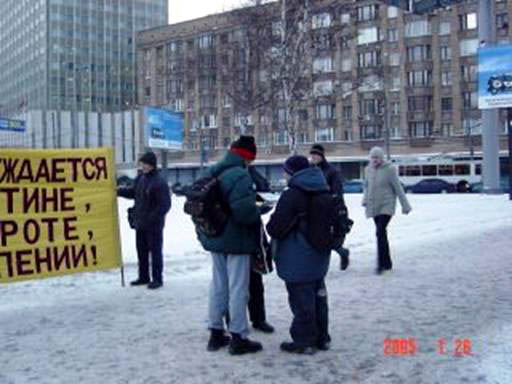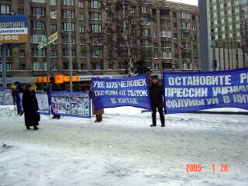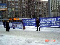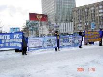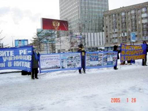 ![]() 在俄罗斯外交部大楼前和平集会,讲真象 | ![]() 学员们打出巨大的横幅及大型的酷刑真象图片。 |