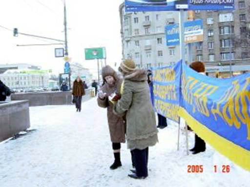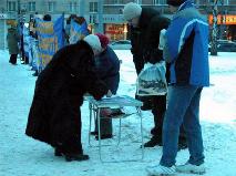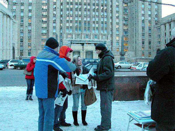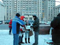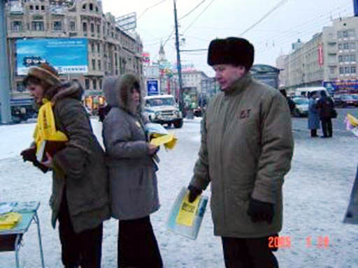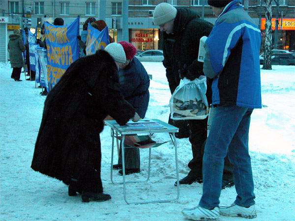 ![]() 学员们迎着凛冽的寒风,向每个过路人发放资料,讲真象。莫斯科市民在知道了真象后都纷纷签名支持反迫害。 | ![]() 市民们签名支持停止迫害法轮功 |