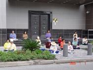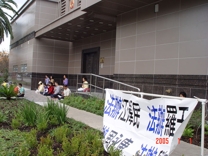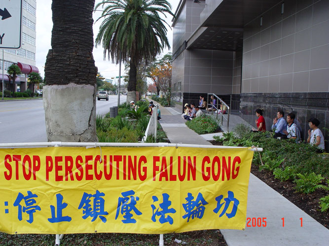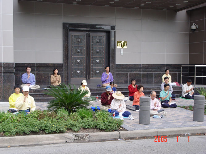 【明慧网2005年1月3日】2005年元旦,休斯顿法轮功学员到中领馆前炼功、发正念,继续呼吁中国政府停止