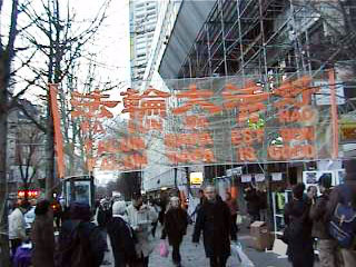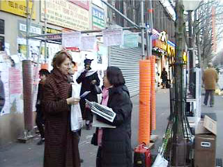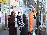 在寒冷的气温下,过往的行人被电视画面和静静炼功的法轮功学员所吸引,纷纷驻足观看,阅读展板并与学员们交谈。明白了真象的人们表示了对法轮功的同情和支持并留下了签名。