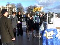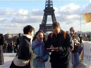 【明慧网2005年1月30日】上个星期,中央电视台的焦点访谈节目企图就2001年天安门广场“自焚”案再一次诬陷法轮功,为此,法国巴黎的法轮功学员于2005年1月22日和23日,即星期六和星期天两天的时间,分别在巴黎的中国城和法国著名景点埃菲尔铁塔下向过往行人讲真象。他们利用大屏幕电视向公众播放影片“伪火”,这部新