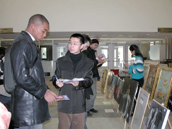 有一些华人观众,因为在过去几年中,听到了太多中共江氏集团的谎言宣传,对法轮功产生偏见,坚决不愿意相信这些迫害是真实存在的,或者误认为法轮功学员揭露迫害是反对中国政府。参加画展的学员们以正念,耐心,祥和慈悲的心态,满面笑容给他们讲真象,告诉他们,法轮功被迫害是千古奇冤,我们不反对任何政府,我们反对的是这场迫害。当观众明白真象后,有不少华人师生也在呼吁明信片上签字,并愿意将真象告诉他们的亲朋好友。