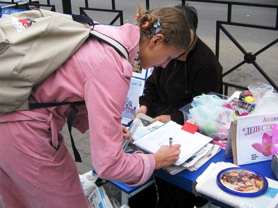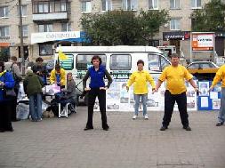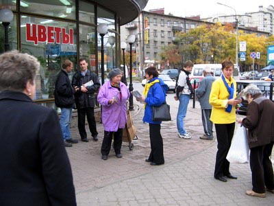 【明慧网2005年10月1日】俄罗斯彼得堡市的法轮功学员们2005年9月24日在“星星”地铁站附近举行了洪法讲真象活动,向人们介绍法轮功以及发生在中国大陆的