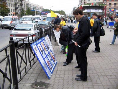 真象。过往的人们纷纷驻足了解情况并签名声援法轮功。