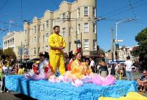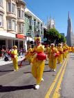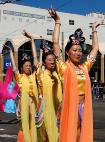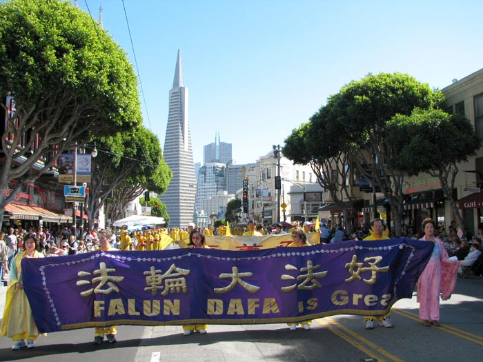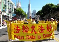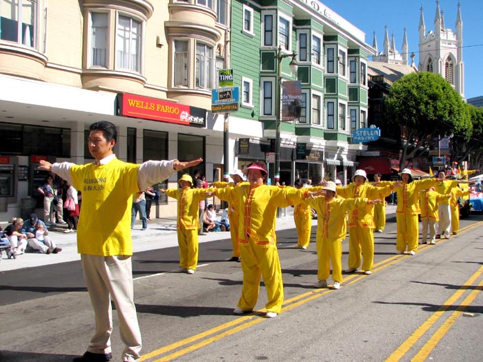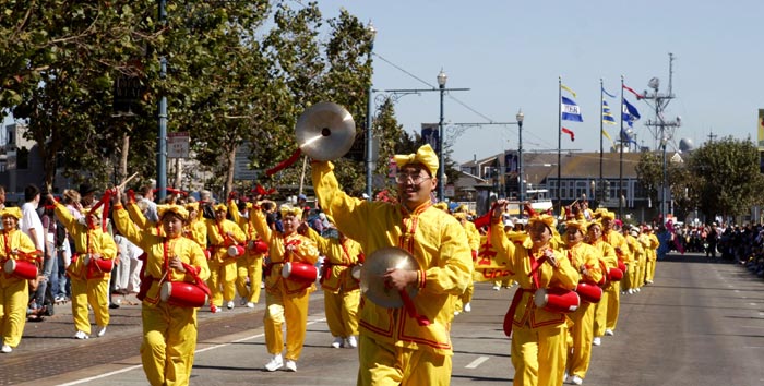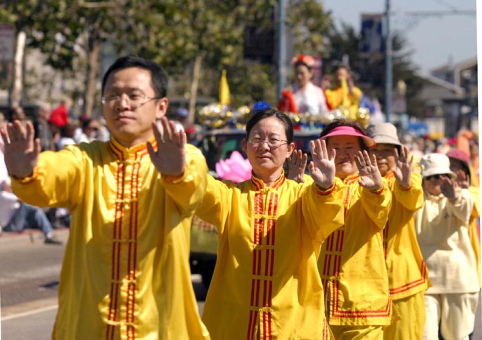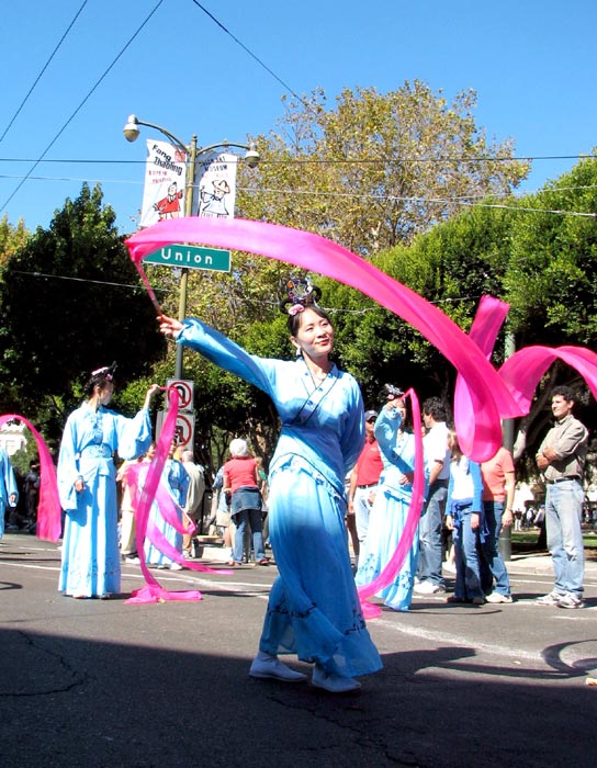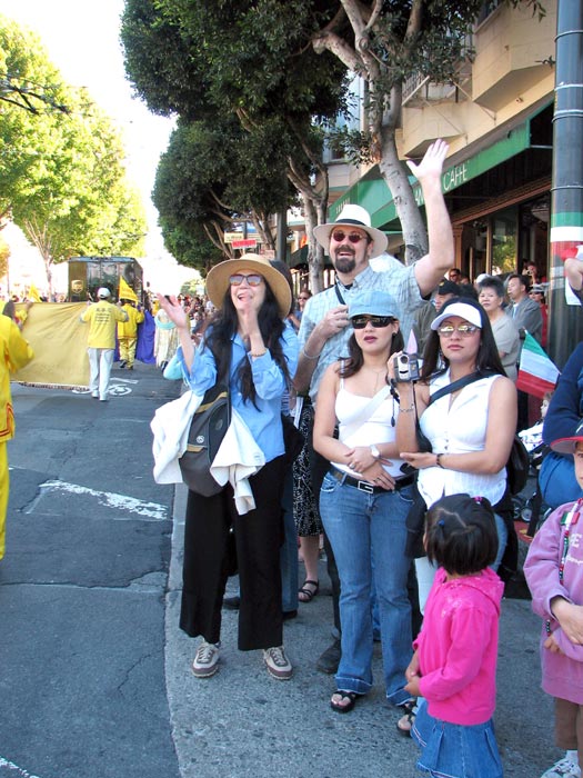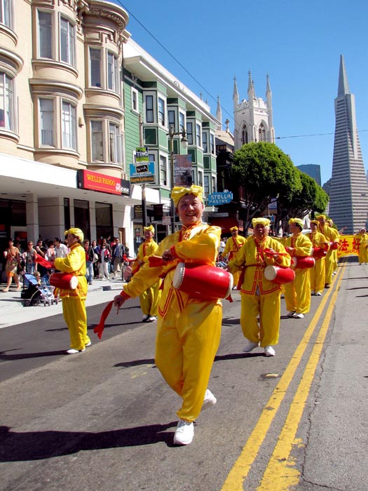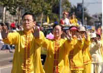 游行队伍中唯一的华人团体队伍——法轮功学员们,特别令人瞩目。学员们有的身着黄色炼功服,有的身着仙女服,把古老的中国修炼功法——法轮功,以及中国的传统腰鼓、仙女舞和彩带舞带到此游行;也把中国的传统文化溶進西方社会。