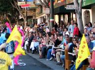 这天,旧金山是个大晴天,阳光明媚,清风气爽。为了庆祝哥伦布传统日,市政府特许这天游行沿途经过的意大利餐馆,把餐桌从室内搬到街道上摆放;让那些慕名前来的游客一边享受美酒佳肴,一边观看大游行。这也成为了哥伦布日旧金山的一大特色风景。