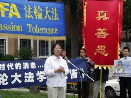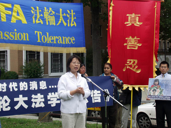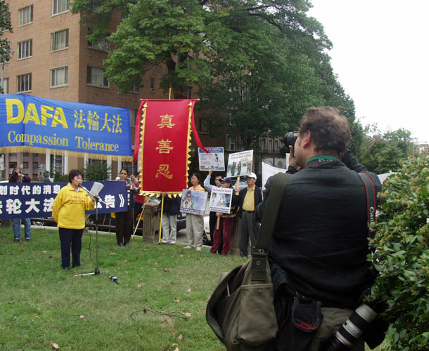 法轮功学员葛女士说,自从1999年7•20江泽民发动对法轮功的血腥迫害以来,华府法轮功学员每天都坚持在中国大使馆前向世人讲述法轮功的真象,无论严寒酷暑,风雨无阻。六年过去了,西方民众如今已经了解了法轮功的真象,针对真善忍的这场迫害不得人心。在海外十几个国家,迫害法轮功的恶首江泽民、元凶罗干、曾庆红等人以及其他多名参与迫害的官员和中共头目被告上了法庭。华府法轮功学员也正告那些至今仍在追随江、曾、罗参与迫害的人悬崖勒马,弃恶从善。