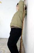 “背挂”。双手反背到背后,两手用手铐铐在一起,然后用绳子系在手铐上吊挂在小号,室内的窗框上或床头上等,吊位低于飞机挂。