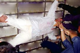 恶警将大法学员的双手背向背后,然后用手铐铐住,再用警绳系在手铐上,或直接用警绳将人以各种方式悬吊起来,并配用电棍。这是一种极其痛苦的刑罚,四肢无法活动,90度大弯腰,一会儿双臂便失去知觉,让人生不如死,极难承受。主要悬吊手段有: