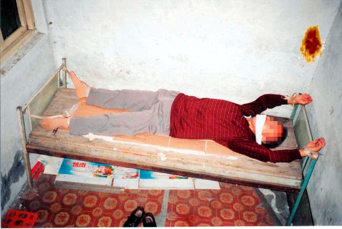 将受刑者固定在床上,手和脚成大字型,用手铐和绳套固定在四个床角上,身体抻的直直的,一动不能动,肌肉被绷得紧紧的,高度紧张。这种酷刑是不间断的,拉尿在床上,没人管,吃饭睡觉也不松开,身体长时间一个姿势,肌肉被抻得绷直,其痛苦无法形容。很多法轮功学员都被这样迫害过。