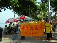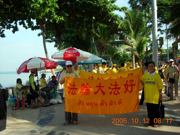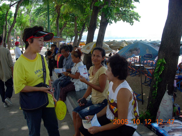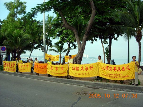 10月8日至19日,中国政府组织了一个七千人的商贸旅游团来泰进行商贸交易,分别活动在曼谷、芭提雅。泰国法轮功学员再次来到这里洪法,帮助人们了解中共江泽民集团镇压法轮功的真象,展现法轮大法的美好,并声援中国大陆无辜被迫害的法轮功学员。