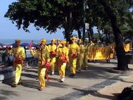 10月12日清晨,在碧波荡漾的海滨响起了一阵阵整齐有力的鼓乐,由法轮功学员组成的腰鼓队,首次出现在芭提雅。随着震动人心的鼓点,法轮功在芭提雅海岸的游行队伍,齐声高呼“法轮大法好”、“法轮大法是正法”,沿海滨而行。一面面写着“法轮大法好”、“世界需要真善忍”的横幅,随风飘荡在长长的海岸线,吸引着南来北往的游客、大巴士和路人,许多人接到了法轮功资料、真象光盘。