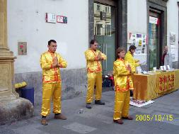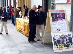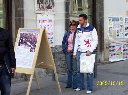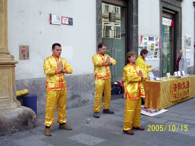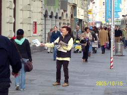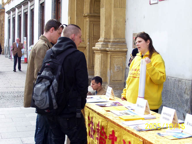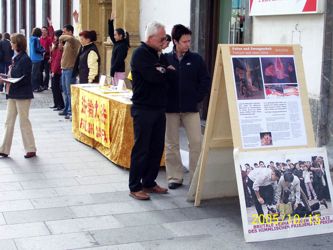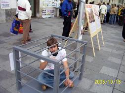 学员们在社区街道发真象资料,面对面向人们讲真象,讲述法轮大法“真、善、忍”的美好和中共邪*党-六年来对法轮功学员的非法迫害。善良的格拉茨人对受迫害的法轮功学员十分同情。人们对做模拟酷刑的学员极为关心,有位妇人用手摸着木牢笼的底座,关切的问,“凉吗?”更有位先生问关在木牢笼里的法轮功学员,“你需要帮助吗?”