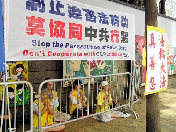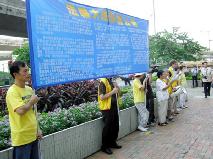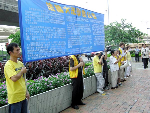 ![]() 香港学员在中联办对面发正念 | ![]() 法轮功学员在香港中联办正门前宣读法轮大法学会公告 |