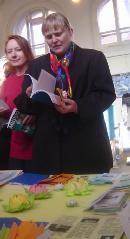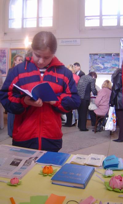 人们对法轮功书籍感兴趣第一天的展览会上来了很多的当地媒体,有3百万观众的《伏尔加》电视台采访了当地的法轮功学员,并在晚间新闻的时候播放,当地另外一家电视台也对法轮功学员参加展览進行了报道。