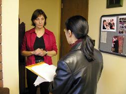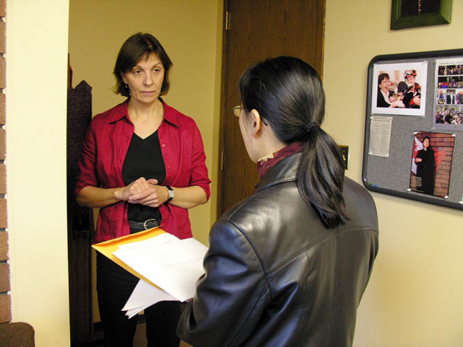 ![]() 陈霞向部长秘书(芭芭拉)介绍广东省迫害法轮功的情况 |