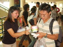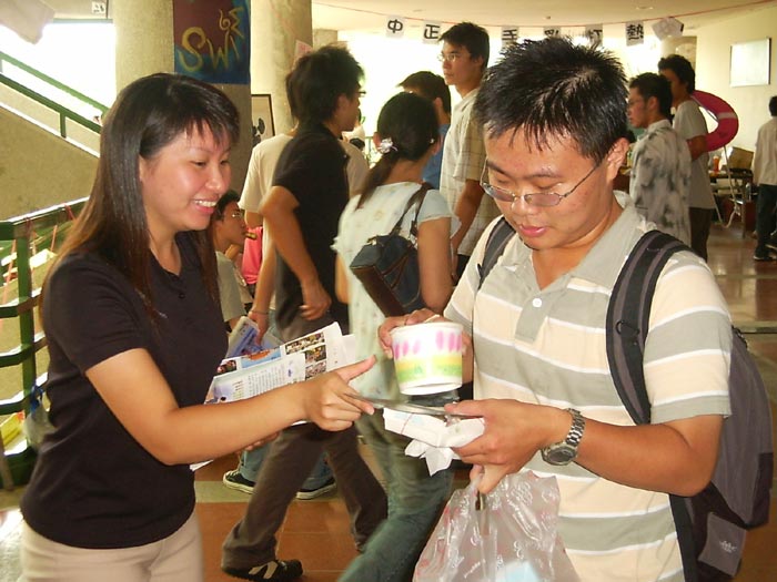 一位学员还向新生们谈到:当自己在大法中身心受益与明白在大陆法轮功所受到的迫害,就想让更多的人来了解大法的美好与受迫害的真象。不管是在校园内外参与洪法或是反迫害讲真象活动,当初父母一听到自己要去参加大法活动时,就会问你的功课呢?到现在,家人一听到自己要参与大法活动,就会问我缺不缺钱参加活动,要不要赞助之类的。除了家人看到在成绩上进步之外,很重要的一点就是让他们清楚明了大法活动的内容在做什么,目地是什么。在这几年参与活动的感觉中,自己只能说大法活动一切坦荡荡,都是为了利于他人而做。自己是学习有关社会工作福利的,在校外实习中,知道别的宗教慈善单位参加活动还有车马费误餐费可拿,在法轮大法中完全没有,学员完全是自愿投入工作与参与活动,都是自掏腰包。看到其他同学去花钱唱KTV、吃大餐、做造型,自己则是把能力许可的钱自愿投入到洪法讲真象中,不管是寄邮件、打电话讲真象、印传单发送,我觉得那才是真正有意义的事情。