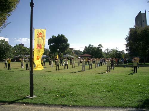 在炼功队列的旁边摆放着6张展板分别介绍了李洪志师尊和法轮大法在世界各地的洪传、发生在中国的迫害真象、在世界各国对迫害元凶江泽民的起诉案以及发生在日本爱知万博期间中国馆对法轮功学员的入馆拒绝事件和法轮大法在熊本洪传的情况等内容。行人不断的停留在展板前,热心了解着真象。