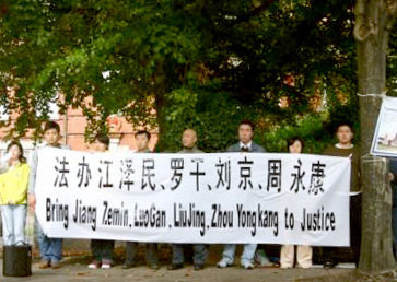 ![]() “法办江泽民,罗干,刘京,周永康”的横幅 | ![]() 法轮功学员在中国驻爱尔兰使馆前宣读《公告》 |
