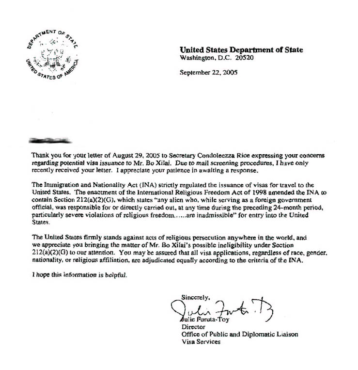 感谢你2005年8月29日写给国务卿莱斯的信,表达你对有关签发给薄熙来签证的关注。因为要检查信件,最近才收到你的信函。感谢你的耐心。