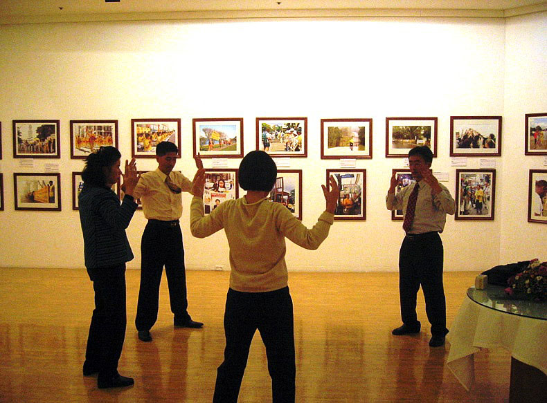 ![]() 参观者学炼功法 | ![]() 学生们听迫害真象 | ![]() 学生们听迫害真象 |