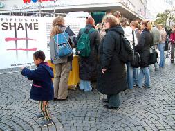 10月18、19日,在德国南部城市奥格斯堡(Augsburg)市中心,德国的法轮功学员们参加了“耻辱地带“的人权罪行巡回图片展,其中以揭露正在中国发生的,中共残酷迫害无辜法轮功学员的图片,尤其让世人不寒而栗。