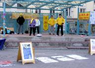 ![]() “国际奥鲁日”中,学员在展台上演示法轮功功法 | ![]() 游人路经时,纷纷驻足观看台上的功法演示 |