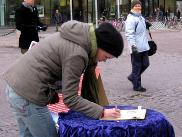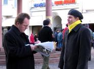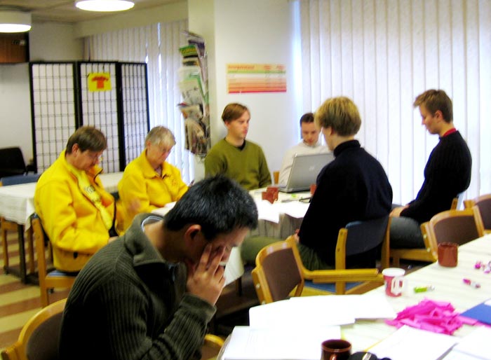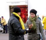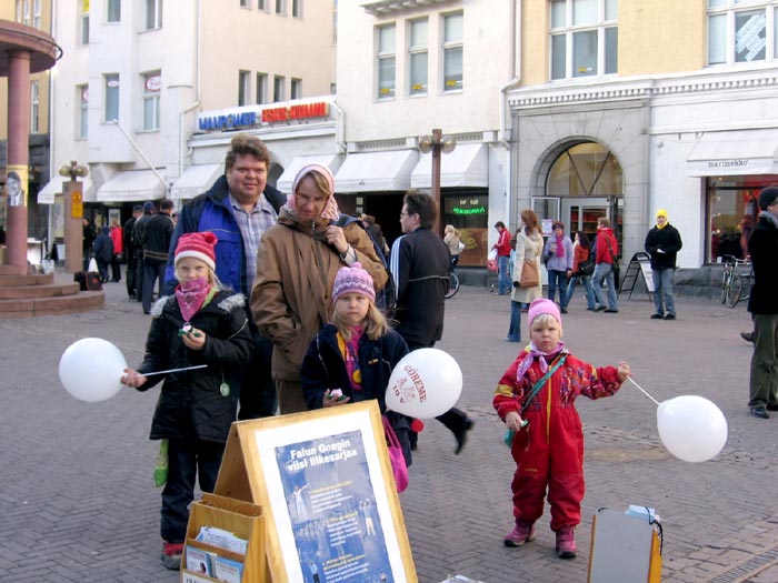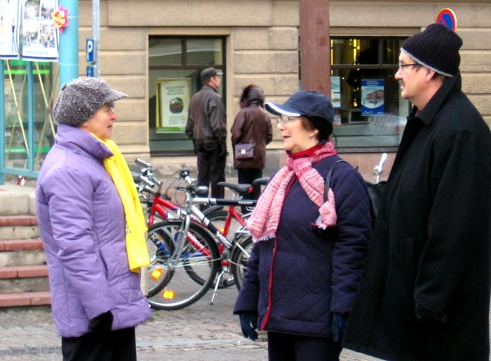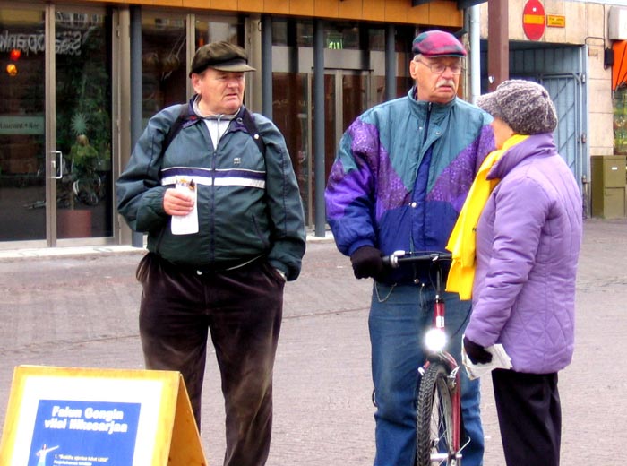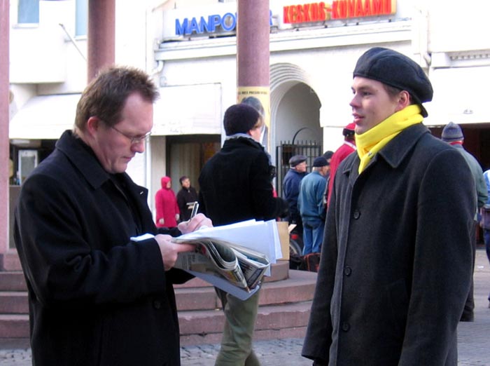 西人学员米高(Mikko)在活动广场巧遇为竞选总统在此活动的Timo Soini先生,米高插空儿上前问:“先生,三年前我见过您,曾给过您法轮功的资料,您还记得我吗?”Timo回答:“记得,你叫米高。”米高非常惊奇Timo如此好的记忆力,并立即送他一本自己随身带的英文版《·九·评*共产党》,Timo高兴的接纳了。