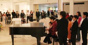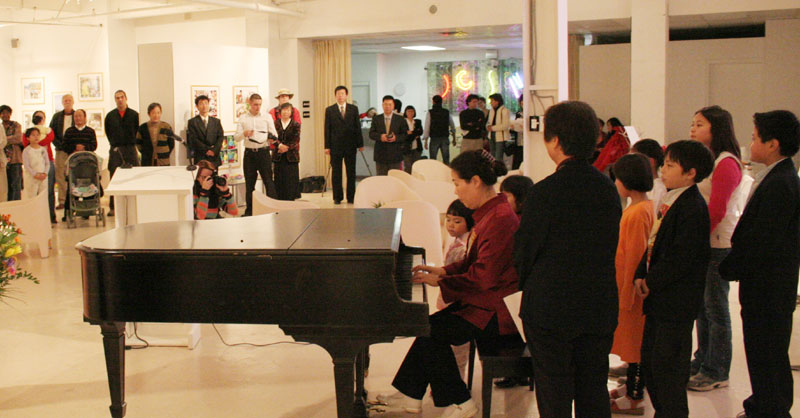 国际特赦组织蒙特利尔分部负责人凯罗(Carole)女士、加拿大法轮大法学会会长李迅先生,以及60多名观众出席了开幕式。蒙特利尔“六艺学社”社长罗列刚先生,为祝贺这次美展,特别表演了箫(《普度》)和古琴(《梅花三弄》)。