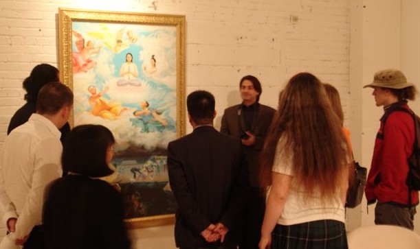 吉里丝女士亲自向来宾和观众介绍了美展的全部作品。这些作品分为四个主题:“同化大法 返本归真”、“生命见证 正信永存”、“传播真象 呼唤正义”和“善恶有报 正义审判”。