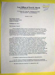 ![]() 人权法律项目的执行理事玛什律师致美国国土安全部部长切尔托夫的信件复印本及右上角之签收证明 |