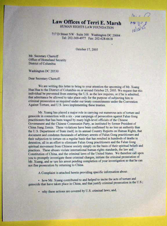 人权法律项目的执行理事玛什律师2005年10月17日致函美国国土安全部部长切尔托夫。玛什律师在信中说,“我们致信提请您关注将于10月25日到访华盛顿特区的黄华华。我们要求依据美国法律禁止其入境。如果允许其入境,目地的也只是为履行反酷刑公约规定的义务和美国法律执行这些条约的要求,对这些人进行刑事起诉。”