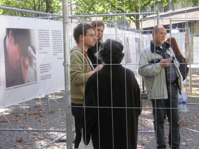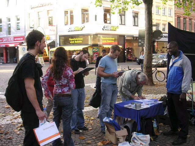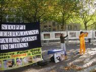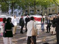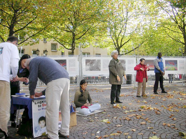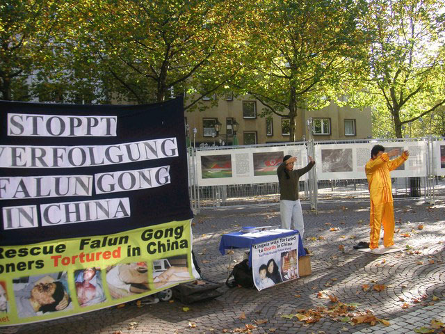 11月初中共领导人胡锦涛将出访德国,法轮功学员向德国民众介绍这一讯息,并征集签名,希望德国总统科勒(Köhle)先生帮助制止在中国对法轮功的迫害。路人纷纷毫不犹豫的签名声援反迫害。其中好几个人对法轮功学员们说,谢谢你们在这里做的一切。谢谢你们让我们了解到在中国发生的真实情况。目前中德经济贸易关系密切,一些德国民众认为,德国政府会首先顾及其经济利益。学员们解释了一个健康的经济贸易关系,需要良好的社会环境;制止迫害,使社会健康发展,将同样将使外国的投资者们受益。