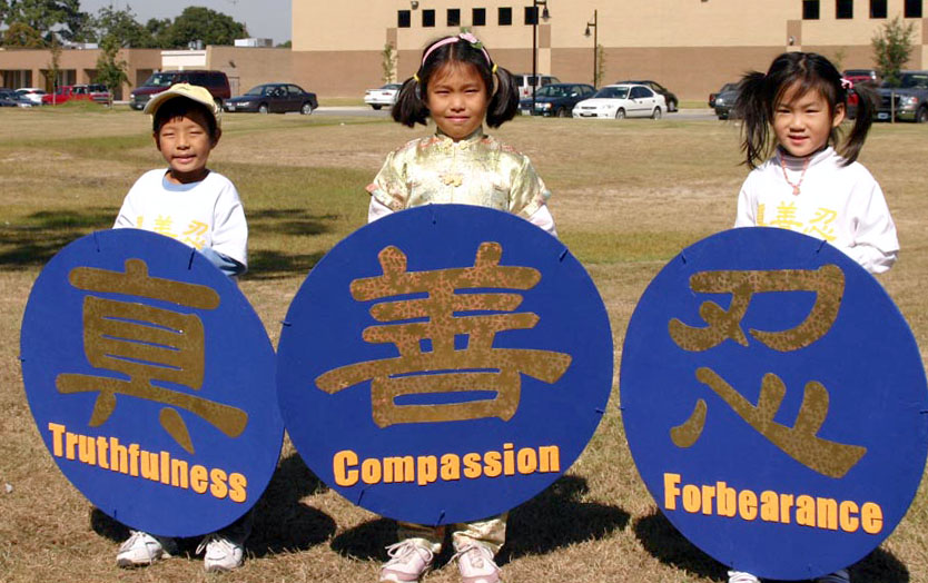 ![]() 法轮大法横幅 | ![]() 明慧学校的部份小弟子拿着“真、善、忍”匾牌 |