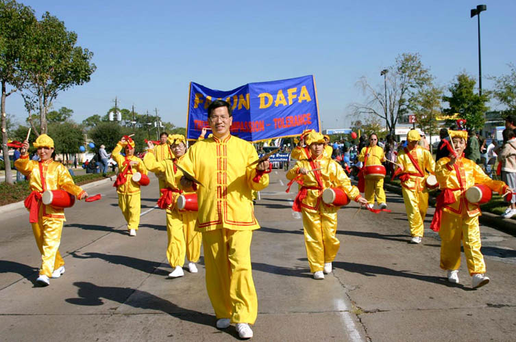 法轮功的队伍包括横幅队、花车、炼功队;为丰富游行的内容,还有的学员穿着唐装表演舞蹈,也有的表演大唐鼓和腰鼓;明慧学校的小弟子也加入了游行。