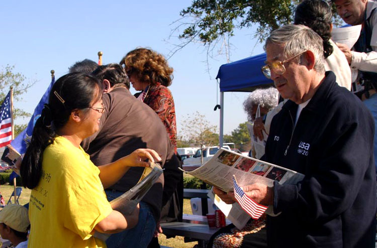 路边的法轮功学员马不停蹄的向观众派发真象报纸——《今日的法轮大法》(《Falun Dafa Today》)。主席台成员也人手一份。突然,一位观众走过来,一边拥抱法轮功学员,一边说:“‘真、善、忍’太好了!”
