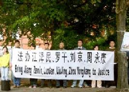 ![]() 法轮功学员在中国驻爱尔兰使馆前宣读《公告》,要求法办江泽民,罗干,刘京,周永康”的横幅 |