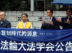 ![]() 在中领馆前宣读“法轮大法学会公告” |