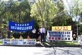 澳洲纽省法轮大法佛学会负责人约翰戴勒先生以及魏先生分别用中英文朗读了公告的内容。公告中表示从10月9日起,各省市的主要官员及中共头目如再有参与或继续迫害法轮功者,从事新的犯罪行为,一旦其离开中国大陆,将受到世界各地法轮功学员原告的刑事起诉和民事控告,追究其刑事责任,并寻求经济赔偿。