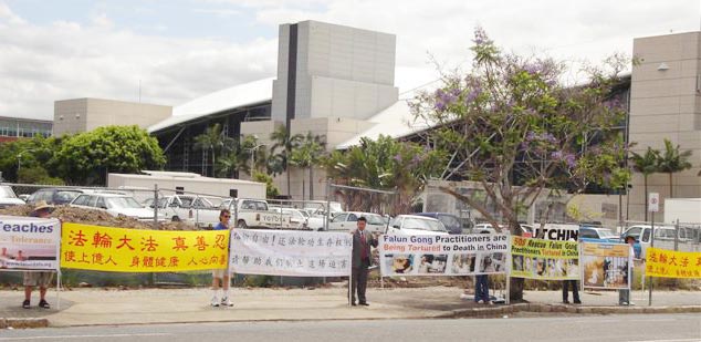 2005年10月18日中午,澳洲昆省部份法轮功学员来到中共在布里斯本市新设立的领馆大楼前,举行“宣读与递交法轮大法学会公告”的活动,旨在告诫中共官员弃恶从善,不要再参与对奉行“真、善、忍”理念的法轮功修炼者的迫害。