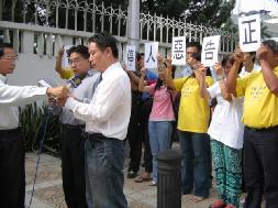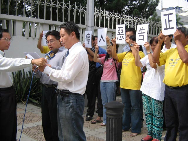 马来西亚法轮功学员于2005年10月24日上午10时在中国驻马大使馆前宣读法轮大法学会公告,正告追随中共迫害法轮功的恶人立即停止参与迫害。