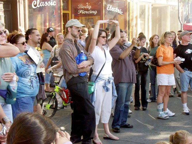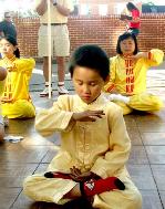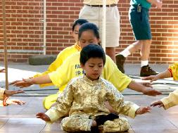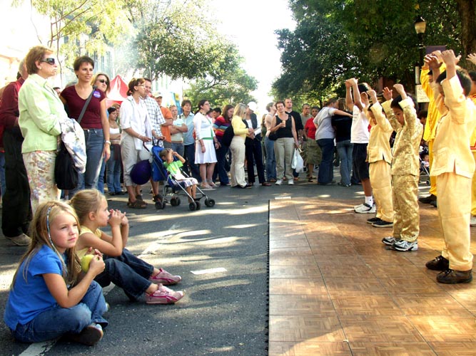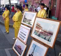 法轮功小弟子表演的功法,吸引了众多的游客的围观。穿着黄色印有大法字样的衣服的小弟子们在街道人群中也很醒目;一位店主看见小弟子T恤衫上的“真善忍”几个字,表现出极大的兴趣,与小弟子聊了很长时间。