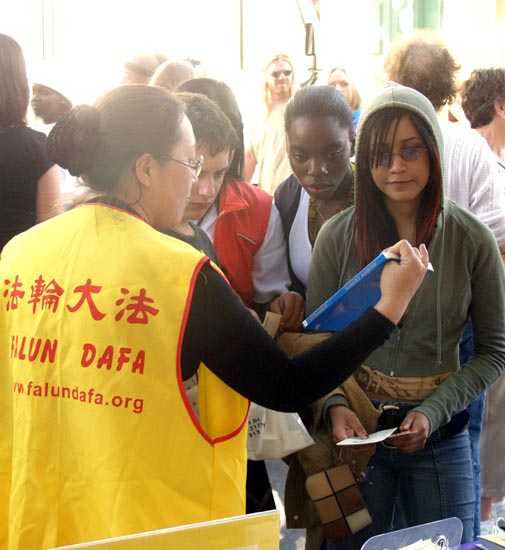 很多游客在摊位前驻足观看,并说:“你们展示的是最佳的。”许多孩子经过时,不由自主的停下来盯着电视,看师父的功法演示。有些人表示,听说过大法在中国受迫害的事,想了解更多的真象;有的询问哪里能学功。许多人要求学员开教功班。